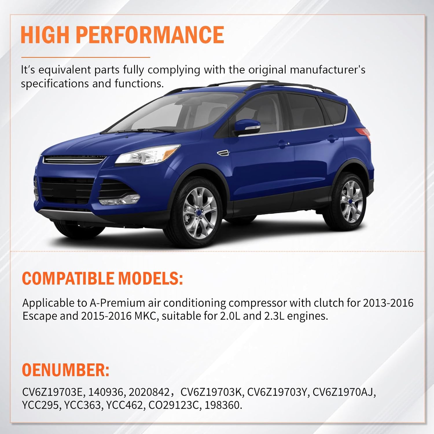 Package Contains: 1 x AC Compressor.Compatible with : for Escape 2013-2016 L4 2.0L for Lincoln MKC 2015-2016 L4 2.0L for Lincoln MKC 2015-2016 L4 2.3L [Note]: Only fit Turbocharged Models, Not Naturally Aspirated Ones.OE Reference Numbers: CV6Z19703E | CV6Z19703K | CV6Z19703Y | CV6Z1970AJ | YCC295 | YCC363 | YCC462 | 140936 | 2020842 | CO29123C | 198360 ⚠️ Installation Notes: - Professional installation recommended (no instructions included). - Check for leaks after installation to ensure optimal performance. 😉FanPaYY is a professional brand specializing in automotive window switches, door handles, repair kits, reversing cameras and other automotive parts. We strive to provide you with cost-effective replacements, if you have any suggestions please feel free to let us know. thank you for your support!