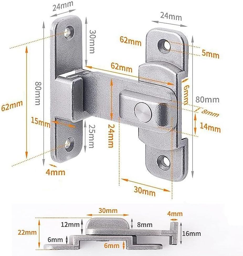 90 degree right angle door latch hasp bending latch buckle bolt sliding lock barrel bolt with screws for doors and windowsFeatures:More thick material, the buckle is welded tightly, and the gravity impact will not be damaged.Can be easily installed on either wood or metal doors for installation flexibilityProtect the safety of you and your family, from the selection of premium door bolts StartEasy to assemble:fix the screw at the hole after confirming the position and tighten it, finally debugging the latch hasp repeatedly.Wide applications:It can be applied on sliding door and room door, cabinet, drawer, furniture, small pet cage and so on, it is also suitable for wooden doors, metal doors and aluminum alloy doors.Specifications:Material: stainless steelColor: silverConstruction: All metalFinish : Smooth GlossInstallation Method : Screws inPackage includes:1 Sets of door latch buckle (include screws )